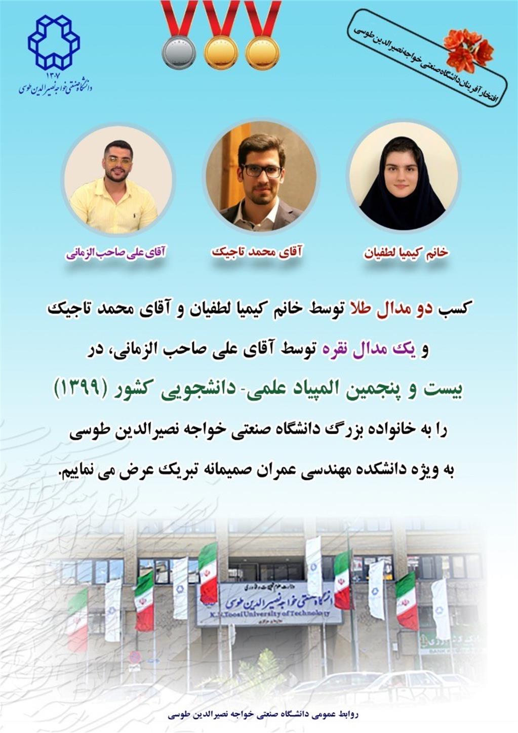 درخشش دانشگاه صنعتی خواجه نصیرالدین طوسی در بیست و پنجمین المپیاد علمی دانشجویی کشور با کسب 2 مدال طلا و یک مدال نقره